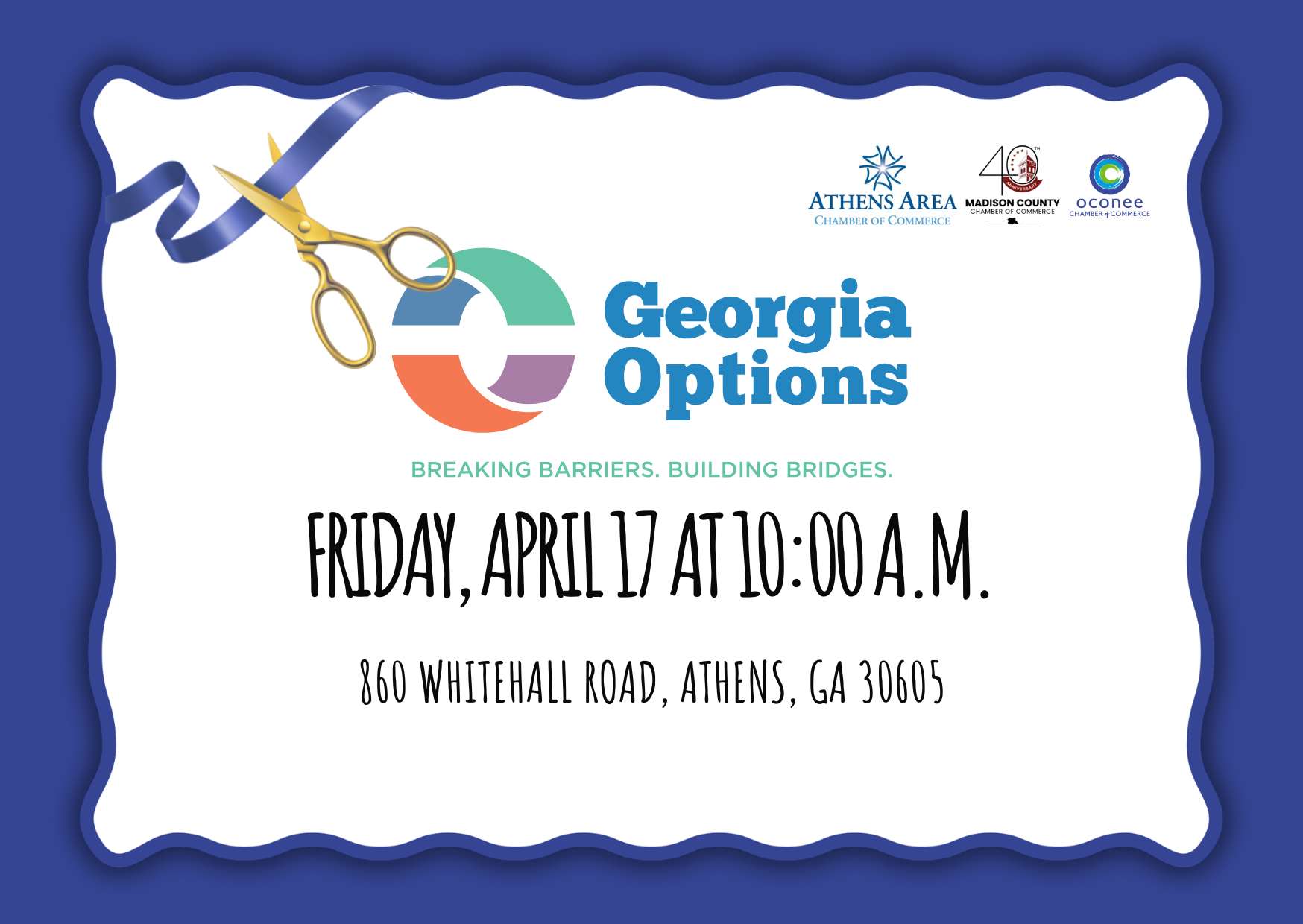 Join the Madison County Chamber of Commerce for a joint ribbon cutting celebration honoring Georgia Options. We are proud to co-host this special event alongside the Athens Area Chamber of Commerce and the Oconee County Chamber of Commerce.
