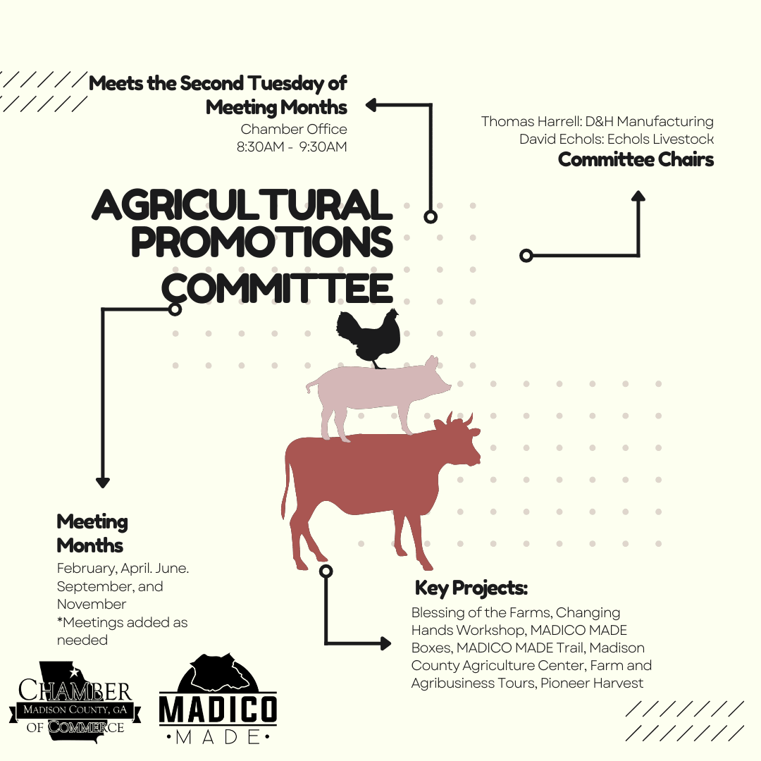 Key Projects: Blessing of the Farms, Yearly Ag Workshop, Georgia Grown Trail 98, Madison County Agriculture Center, Farm & Agribusiness Tours, State of Agriculture, Pioneer Harvest Festival