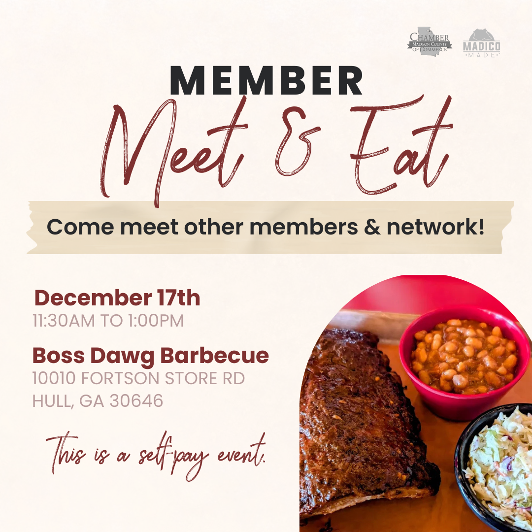 Please join us for a pop-in style Chamber event! Our next Member Meet and Eat is slated to take place on December 17th from 11:30AM to 1:00PM at Boss Dawg Barbecue. This is an informal way for Chamber members to meet and network; joining one another in community while also supporting one of our local restaurants.