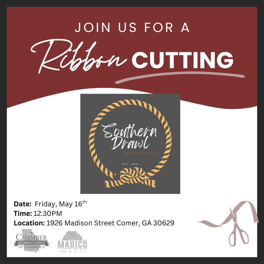 Please join us for a ribbon cutting as we celebrate a new member and new restaurant in Comer, Southern Drawl Bar & Grille. The ribbon cutting celebration will begin at 12:30PM on Friday, May 16th! We look forward to celebrating with you!
