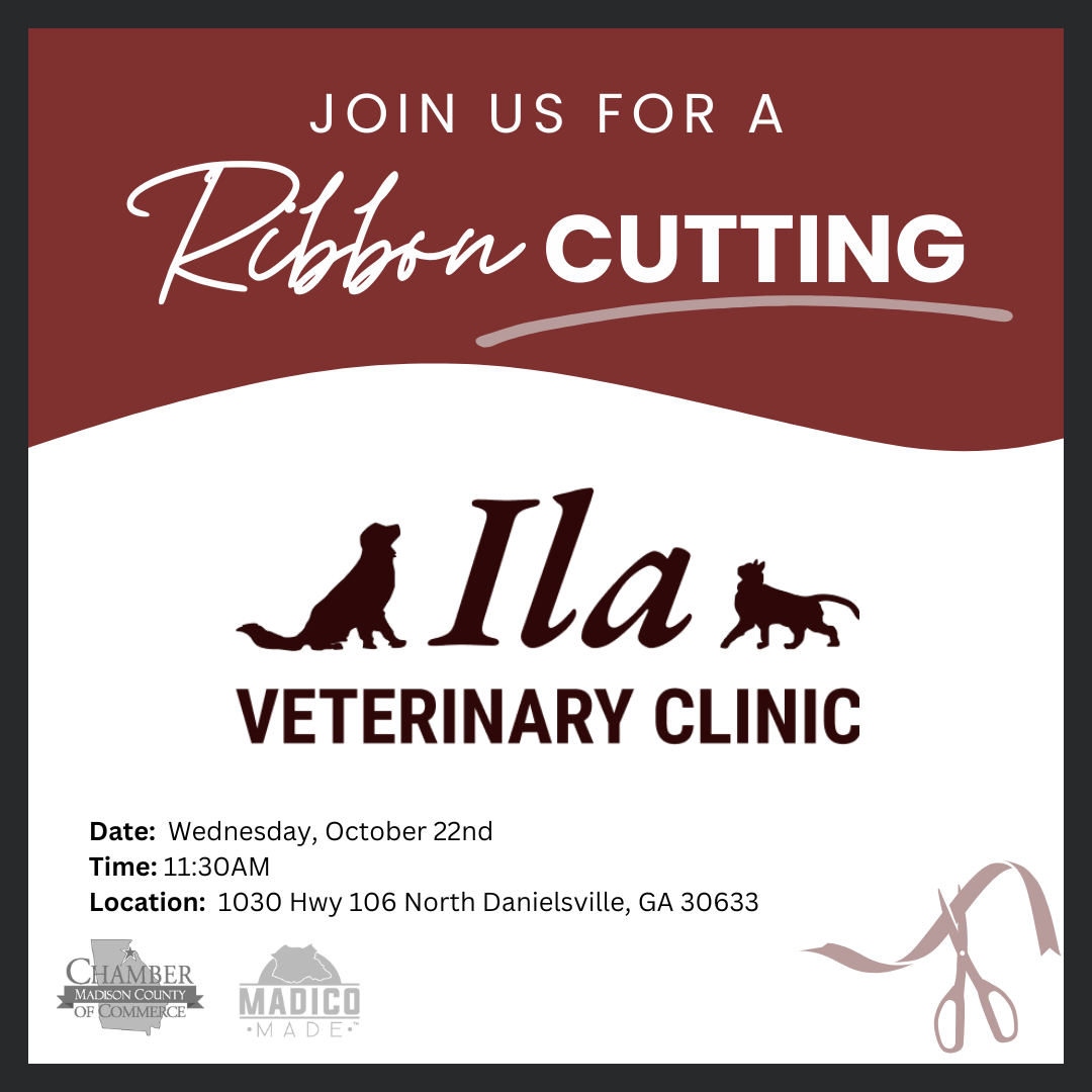 You are invited to join us for the ribbon cutting ceremony for Ila Veterinary Clinic on Wednesday, October 22 at 11:30 AM, an early sneak peek at Ila Veterinary Clinic before our official grand opening. Located at 1030 Hwy 106 N, Danielsville, Ila Veterinary Clinic offers compassionate veterinary care including wellness exams, vaccinations, parasite prevention, laser therapy, soft‑tissue surgery, dental care, reproductive services, and more.