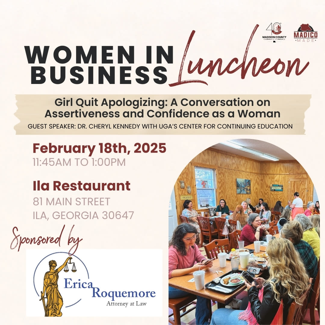 Hey Madison County Women in Business! Please join us for a lunch and learn on Tuesday, February 18th 11:45AM to 1:00PM at Ila Restaurant. We are excited to host a conversation titled "Girl Quit Apologizing: A Conversation on Assertiveness and Confidence as a Woman". Our guest speaker will be Dr. Cheryl Kennedy with the University of Georgia's Center for Continuing Education.