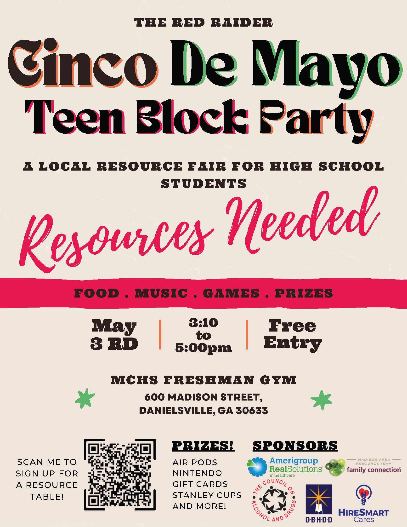 M.A.R.T.’s Second Annual Red Raider Block Party will take place on Friday, May 3rd from 3:10 pm to 5:00 pm at the MCHS’ 9th grade Freshman gym. The “party” is a teen resource fair for high school students in Madison County. Free food, a DJ, and great prizes including Airpods, a Nintendo Switch, gift cards, and more will be available.
