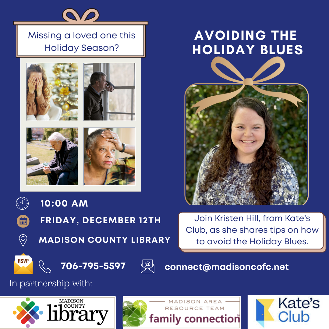 The holiday season can be especially challenging for those missing a loved one, and no one should have to navigate that experience alone. Make plans to attend the “Avoiding the Holiday Blues” workshop, a supportive and informative session designed to help individuals cope with grief and emotional stress during the holidays.This event is taking place on Friday, December 12th at 10:00AM at the Madison County Library. Kristen Hill from Kate’s Club will lead the discussion, offering practical tips, compassionate guidance, and helpful resources for finding moments of peace and connection this time of year.