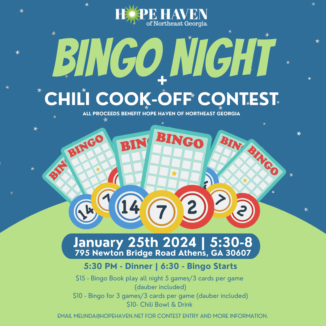 Hope Haven of Northeast Georgia is hosting a Bingo Night and Chili Cook Off Contest on January 24th! Dinner starts at 5:30PM and Bingo will begin immediately after at 6:30PM. All proceeds raised from the event benefit Hope Haven of Northeast Georgia!