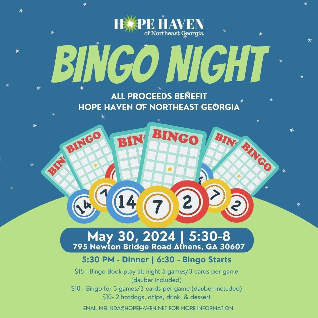 Join Hope Haven of Northeast Georgia for a Bingo Night on May 30 from 5:30 - 8:00 p.m. They will serve dinner at 5:30, and bingo begins at 6:30!