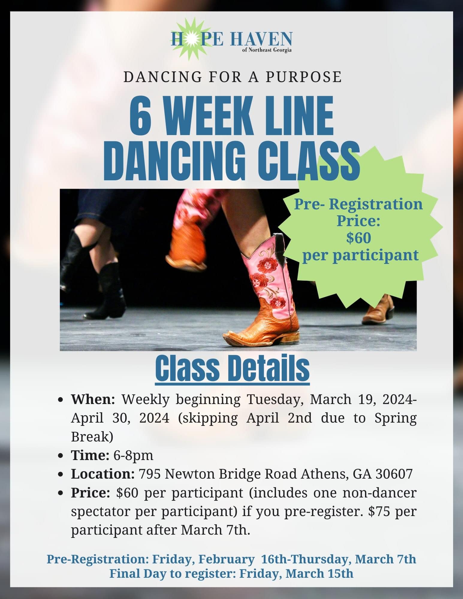 Hope Haven of Northeast Georgia is hosting line dancing classes every Tuesday from 6:00PM to 8:00PM beginning on March 19th.