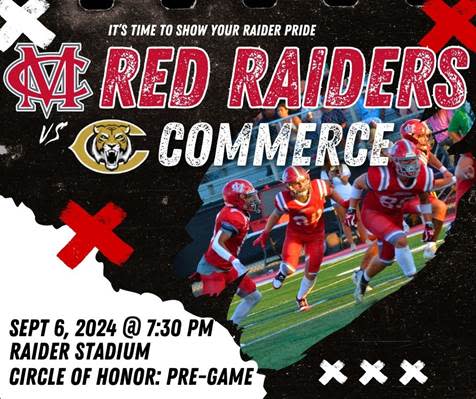 Please cheer on our Madison County High School Red Raiders football team as they play against Commerce on Friday, September 6th at 7:30PM. This game will also include a Circle of Honor Presentation! Go Red Raiders!
