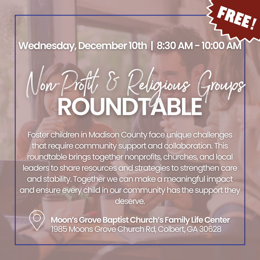 The Madison County Chamber invites all nonprofit leaders and faith based partners to a FREE community roundtable on Wednesday December 10th at Moon's Grove Baptist Church's Family Life Center beginning with networking at 8.30 a.m. and followed by the program from 9 a.m. to 10 a.m.