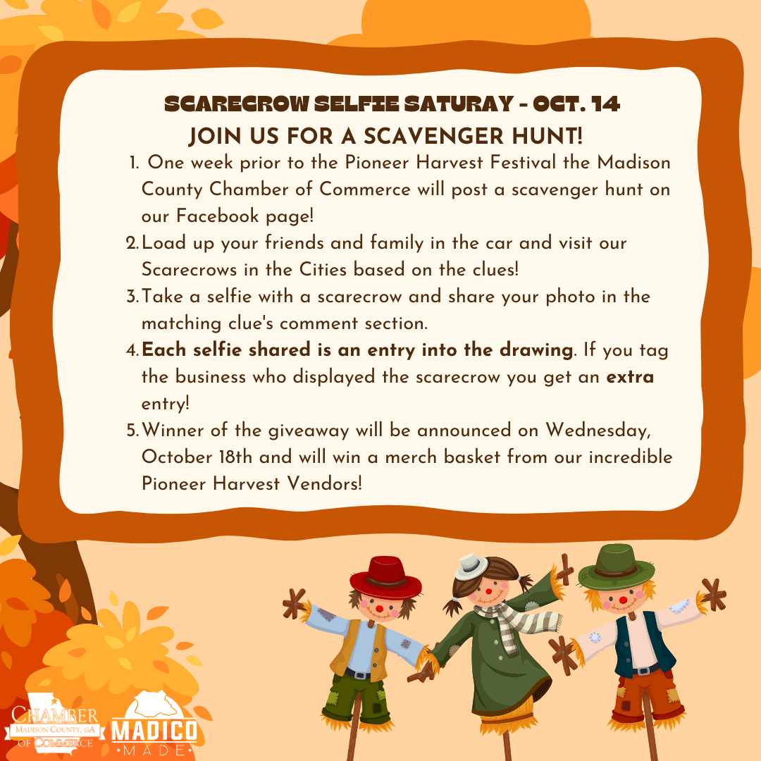 On October 14th, 2023 check out the Chamber's Facebook Page to get the clues for the "Scarecrows in the City - Selfie Saturday Scavenger Hunt". The clues will point you to each participating city's scarecrow displays where you will get to take a Selfie with a Scarecrow that matches that clue. Simply post your selfie in the comment section of the clue and be entered into a drawing to win a prize. Each selfie is one entry into the drawing. You will have an additional opportunity to enter if you tag the scarecrow's business in the comments! We cannot wait to see your BEST Scarecrow Selfies!