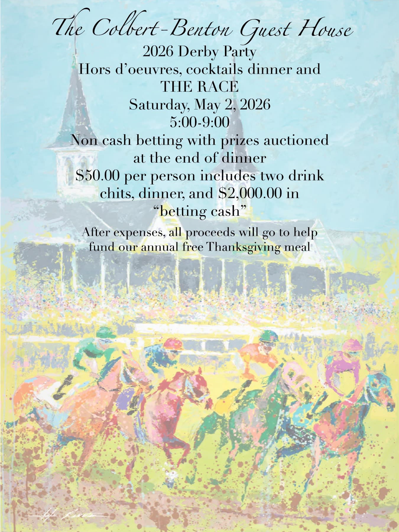Your $50 per person reservation includes two drink chits, dinner, and $2,000 in non-cash “betting cash” to use throughout the evening. Guests can place friendly, non-cash bets during the race, with prizes to be auctioned off at the conclusion of dinner. After expenses, all proceeds will support the Guest House’s annual free Thanksgiving meal, making this a night of fun with a meaningful impact.