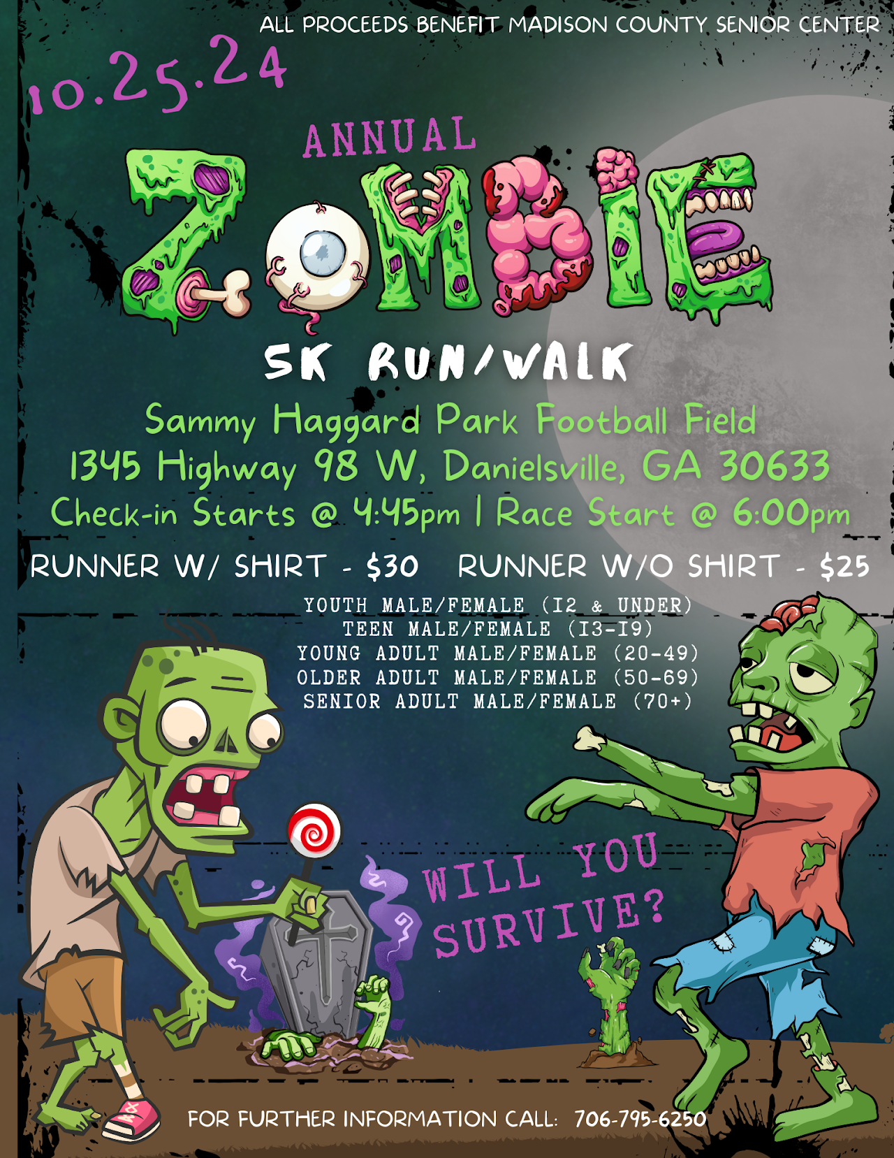 In conjunction with the MCRD Halloween in the Park event, the Madison County Senior Center is partnering to host their first ever fun run! Yes, this 5K is strictly for FUN! There will be a timer and prizes given out for the following age groups male/female: