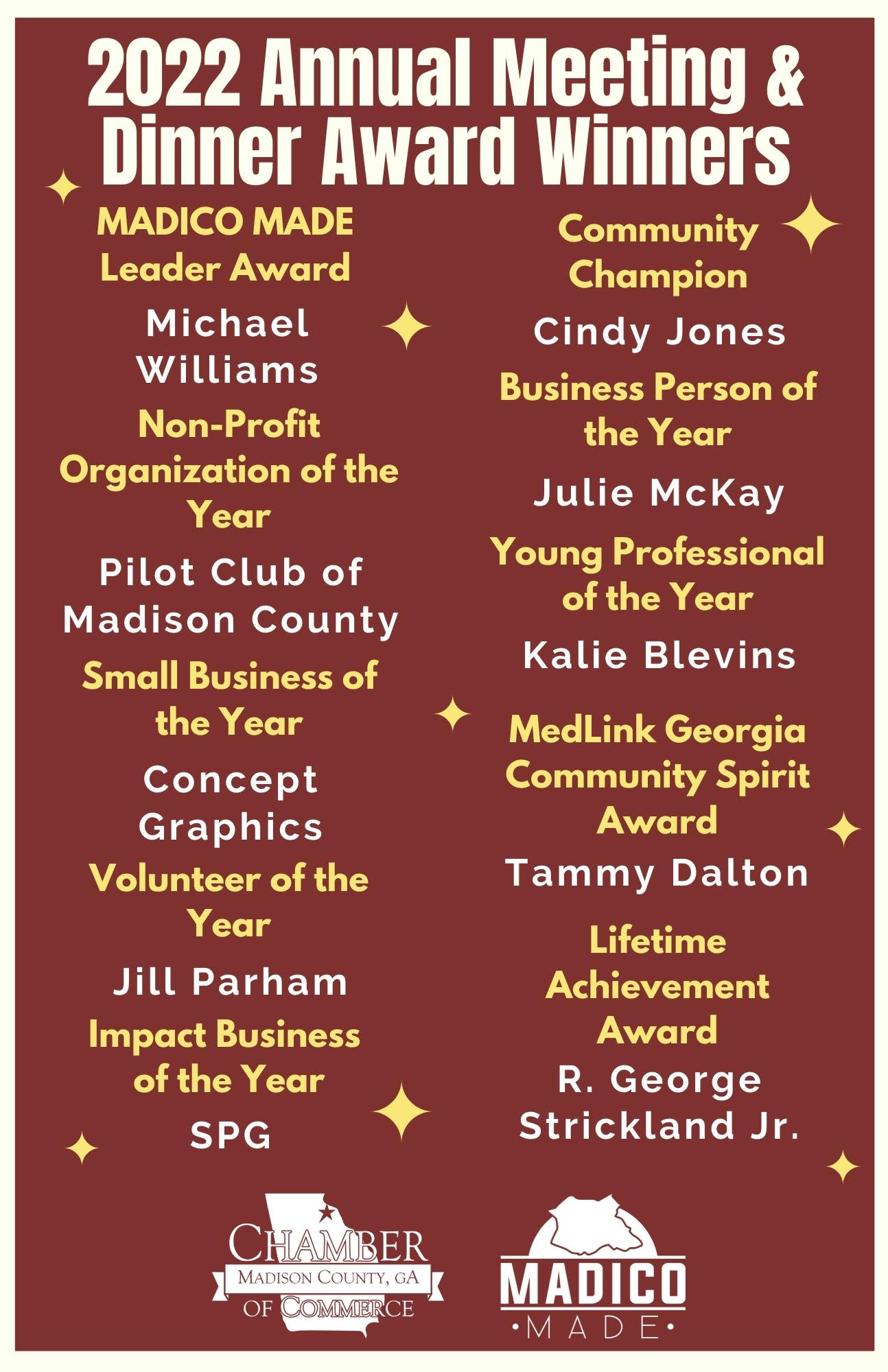 On February 3rd, the Madison County Chamber of Commerce held its Annual Meeting and Dinner at Grant Hill Farms, a local event venue and Chamber member. It was an incredible event highlighting the community's and members' accomplishments over the last year. We are so thankful for the outstanding members who have gone above and beyond for this community and this growing organization. Thank you to everyone who attended, and we look forward to seeing the future success of our community!