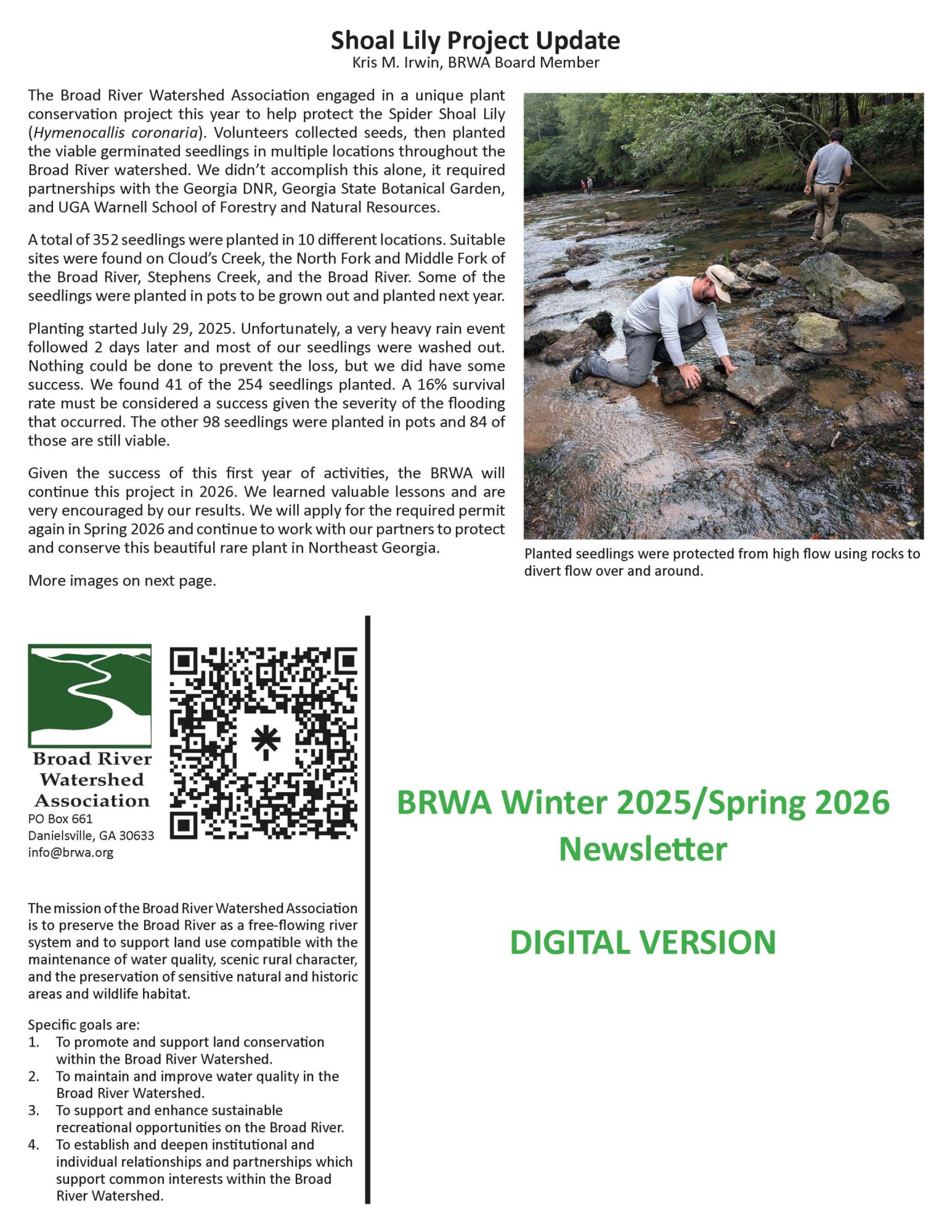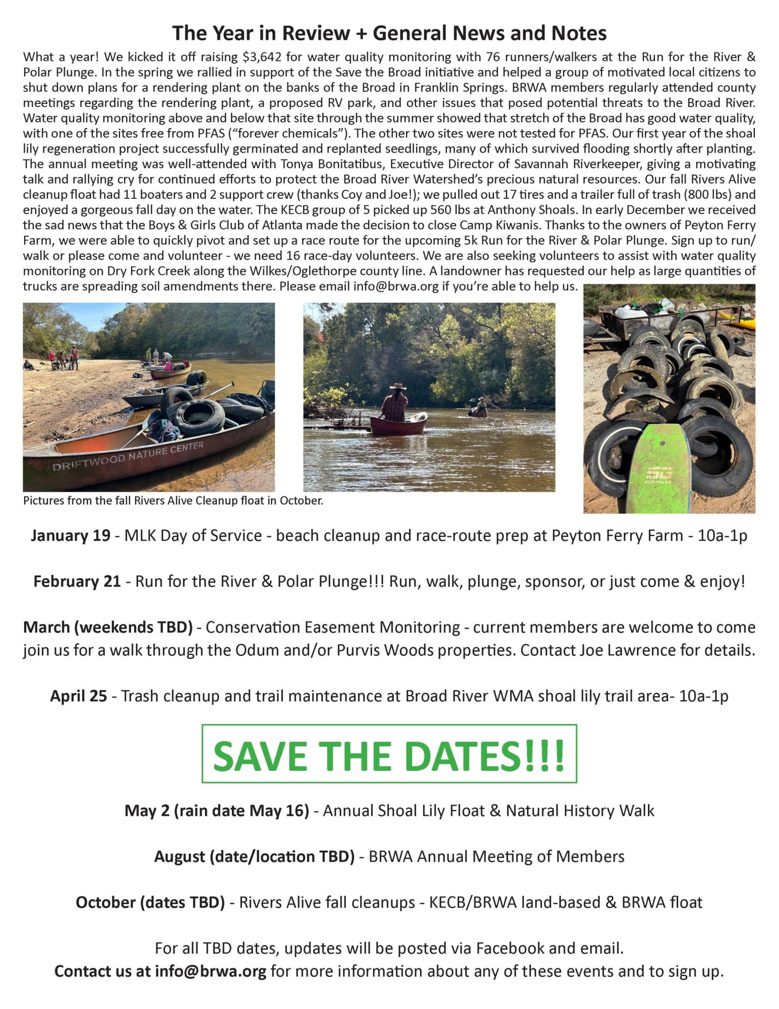 The Broad River Watershed Association (BRWA) is pleased to share the Winter 2025/ Spring 2026 newsletter. This issue highlights recent conservation work, upcoming events including the Run for the River 5K and Polar Plunge, and ways the community can support the Broad River.