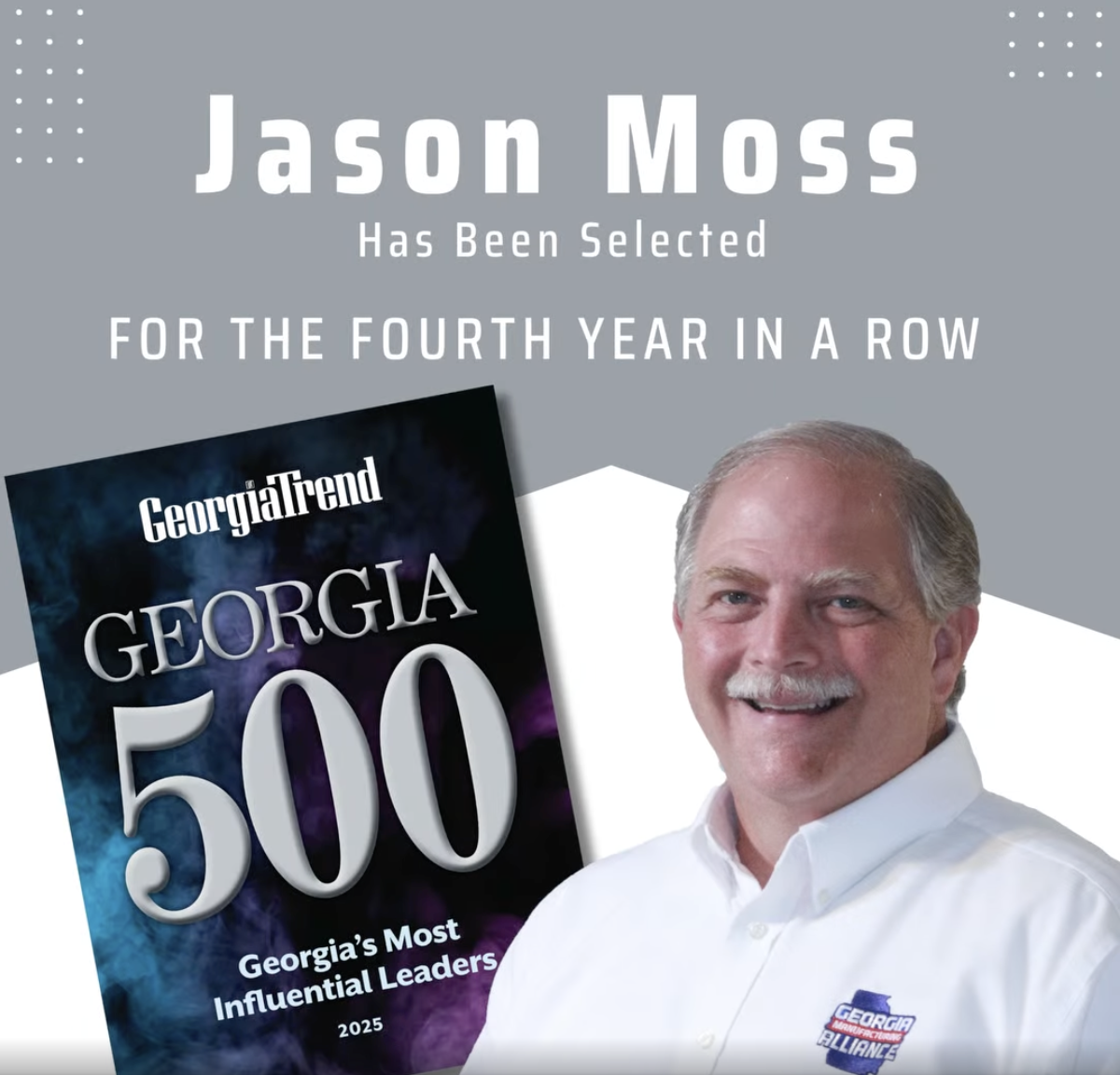 The Chamber is proud to recognize Jason Moss, Founder and CEO of the Georgia Manufacturing Alliance (GMA), for earning a place on the 2025 Georgia Trend 500 Most Influential Leaders list, an honor he has now received for an impressive four years in a row. This recognition reflects not only his leadership, but the growing momentum of Georgia’s manufacturing community.