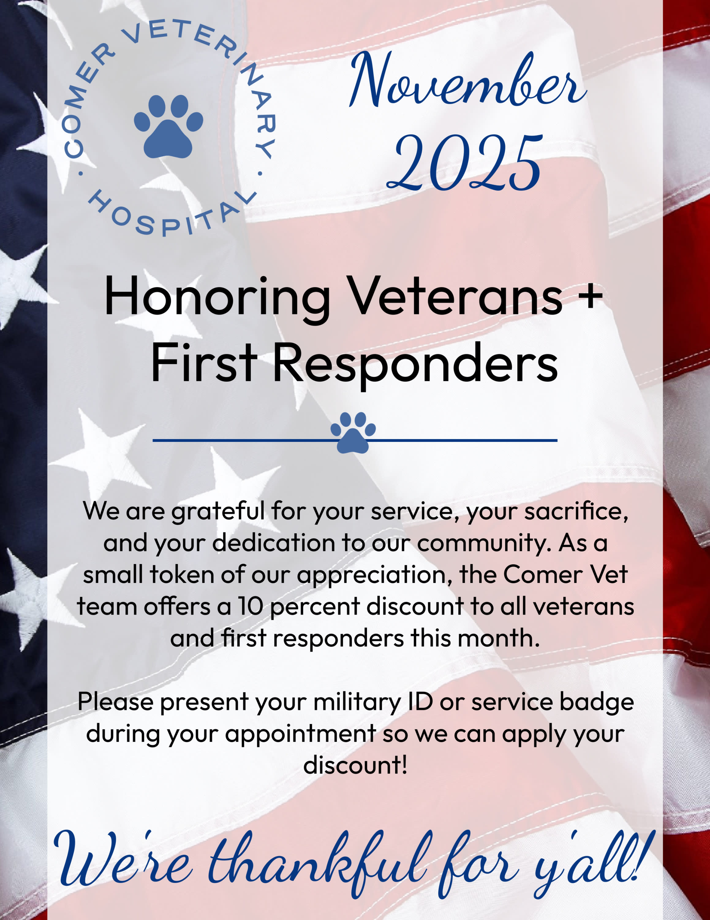 As a small token of our appreciation, the Comer Vet team is offering a 10 percent discount to all veterans and first responders this month. Please present your military ID or service badge during your appointment so we can apply your discount!