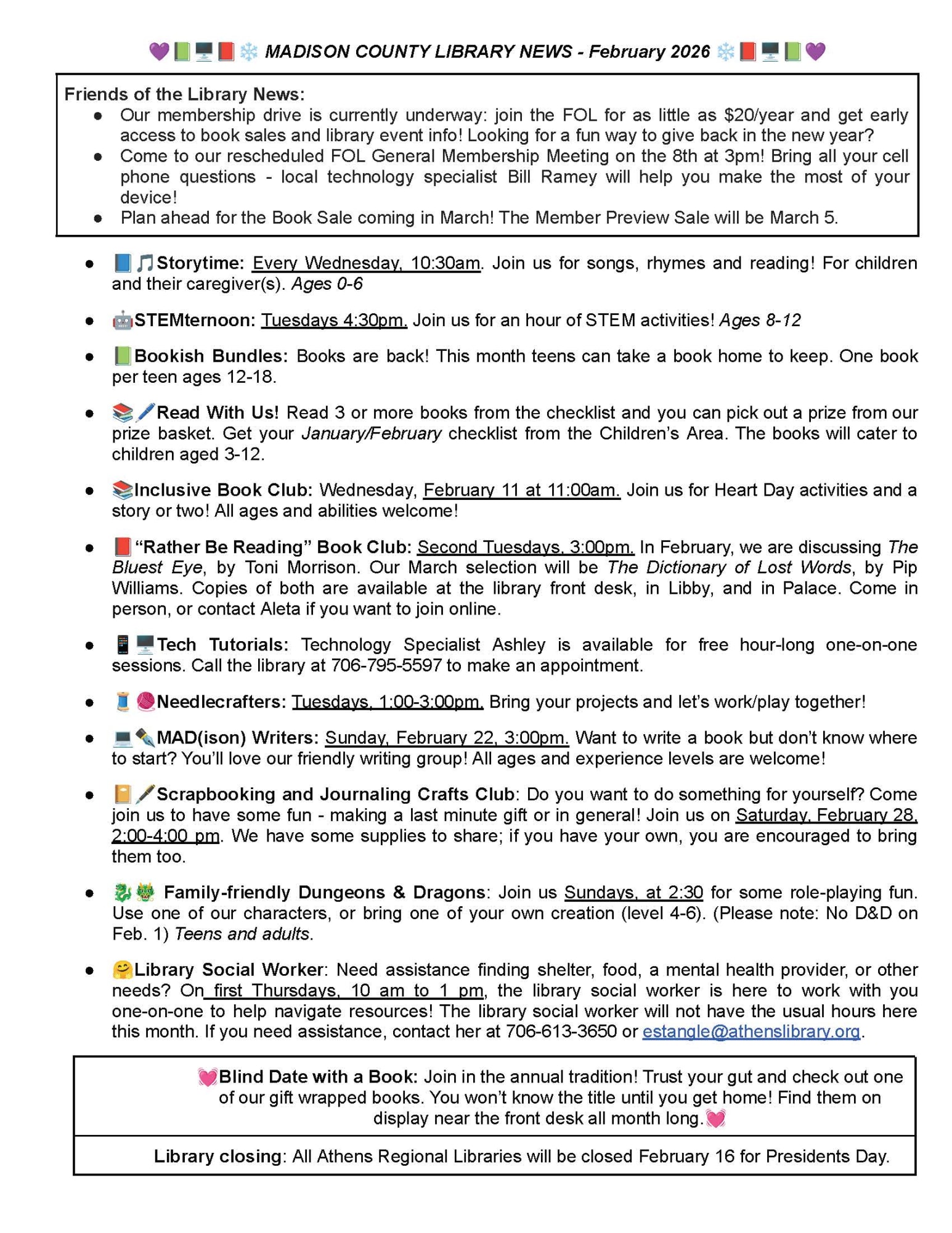 This February, the library has programs for all ages! Enjoy storytimes, STEM activities, book clubs, crafting, writing groups, Dungeons & Dragons, and one-on-one tech help. Check the newsletter for full details and dates—there’s something for everyone!