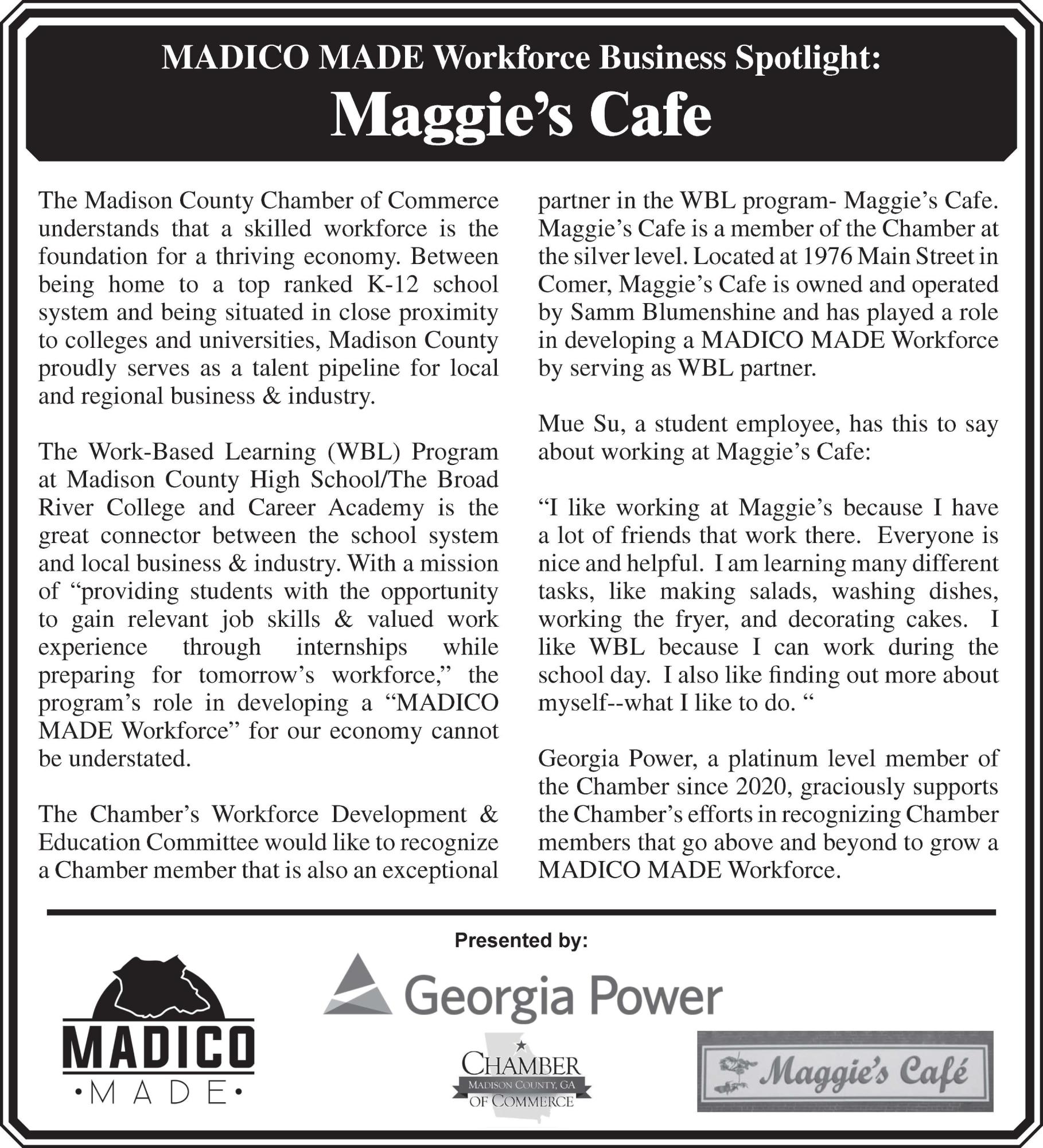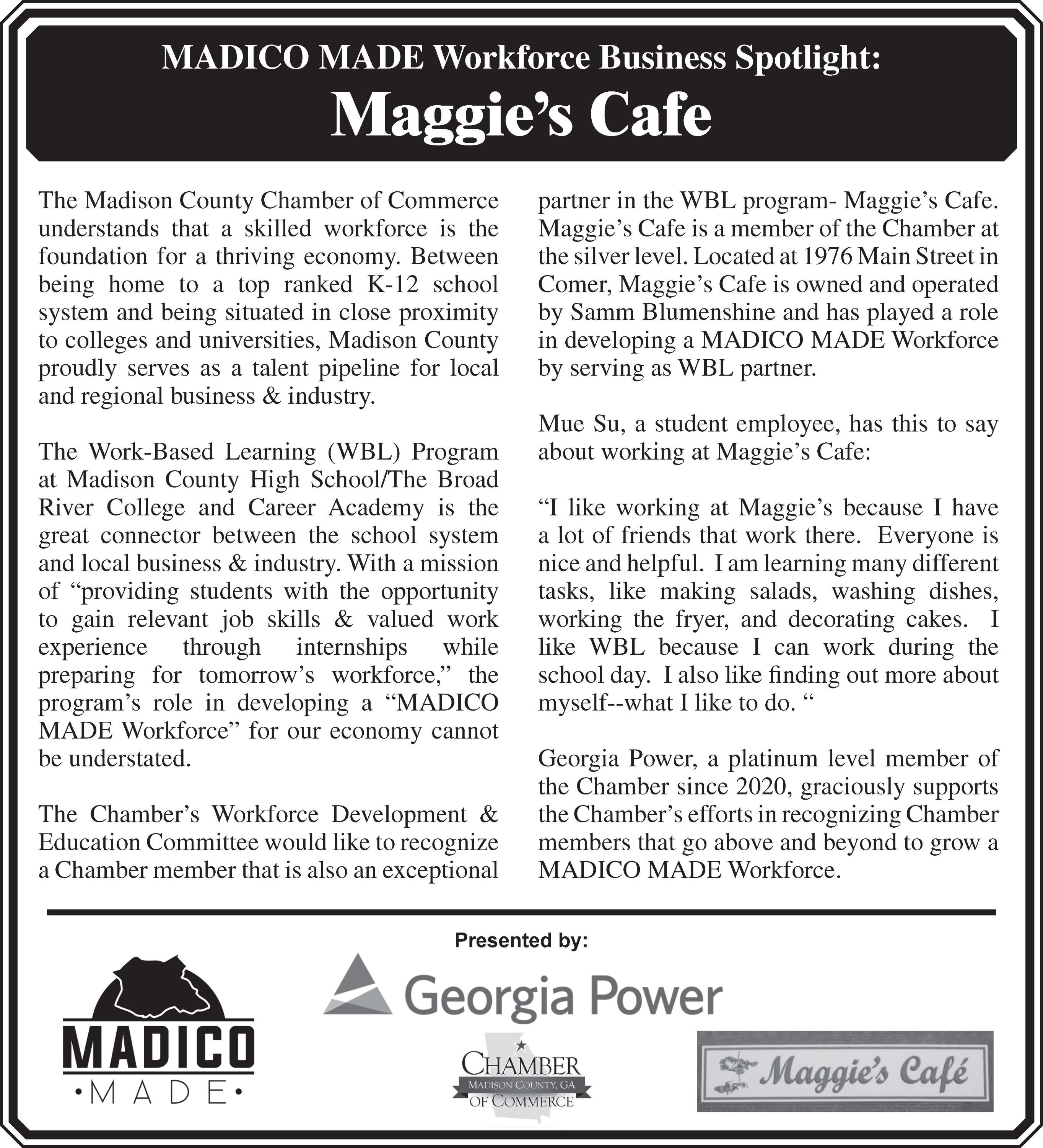 MADICO MADE WORKFORCE SPOTLIGHT: Maggie's Cafe Back to News Items MADICO MADE WORKFORCE SPOTLIGHT: Maggie's Cafe By Madison County Chamber of Commerce 12/13/2021 Images × Share × Email Facebook LinkedIn X Pinterest Powered By GrowthZone