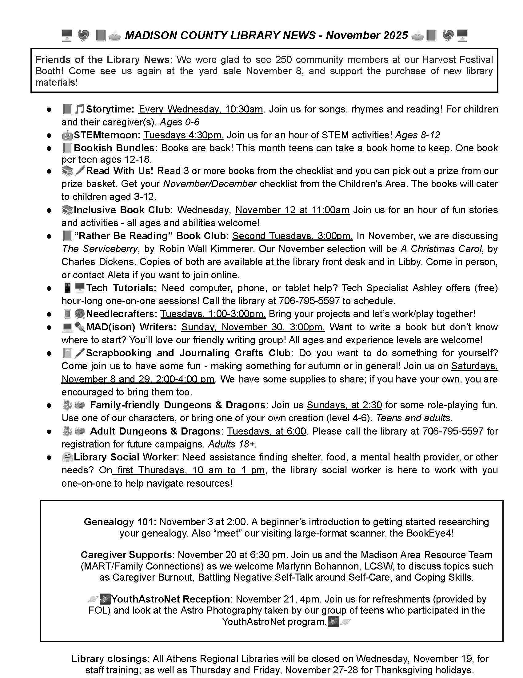 📌 Note: All Athens Regional Libraries will be closed Nov. 19 for staff training, and Nov. 27–28 for Thanksgiving.