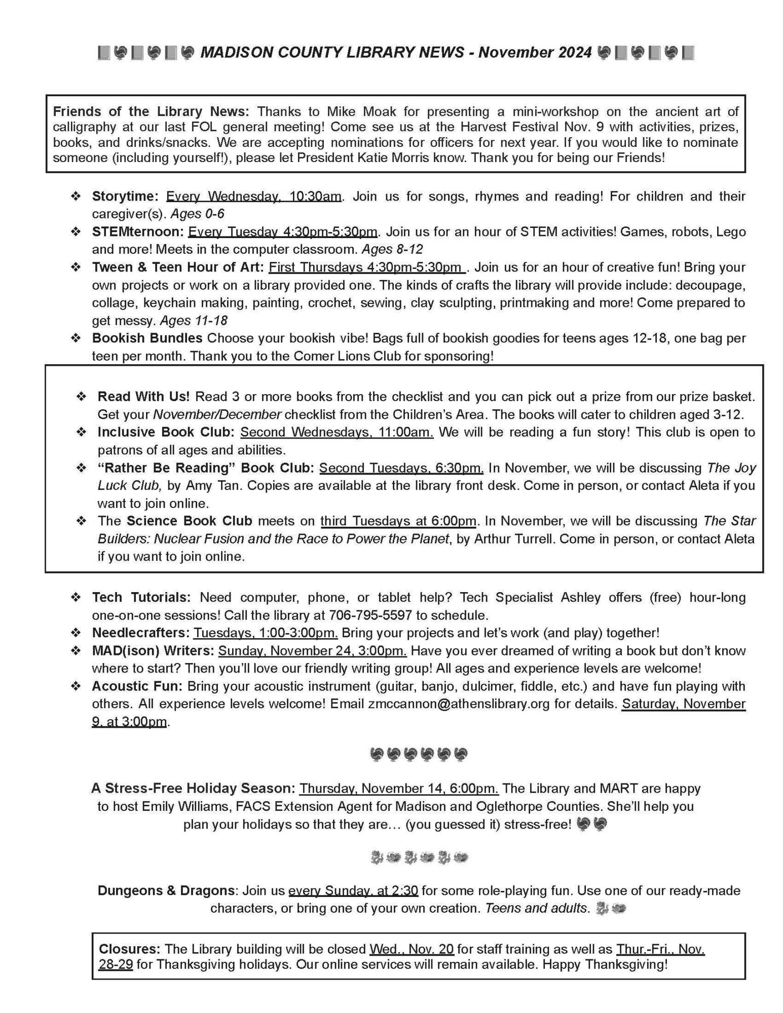 Madison County Library November Events and Newsletter Back to News Items Madison County Library November Events and Newsletter By Friends of the Madison County Library 11/6/2024 Images × Share × Email Facebook LinkedIn X Pinterest Powered By GrowthZone