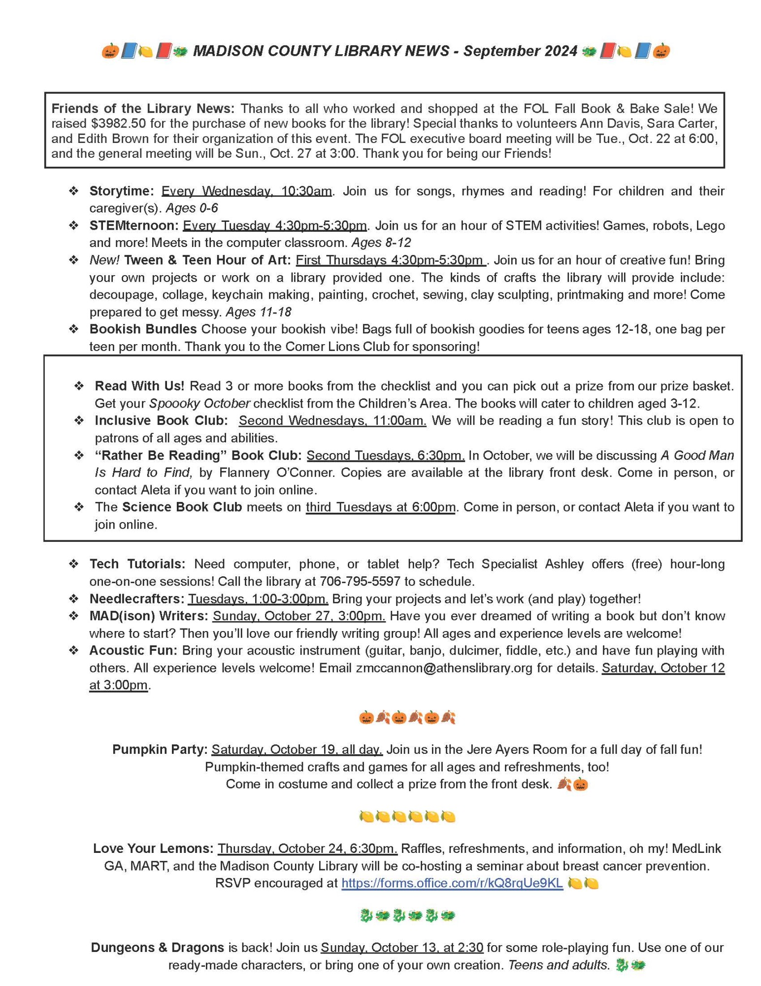 Madison County Library October Events and Newsletter Back to News Items Madison County Library October Events and Newsletter By Friends of the Madison County Library 10/2/2024 Images × Share × Email Facebook LinkedIn X Pinterest Powered By GrowthZone