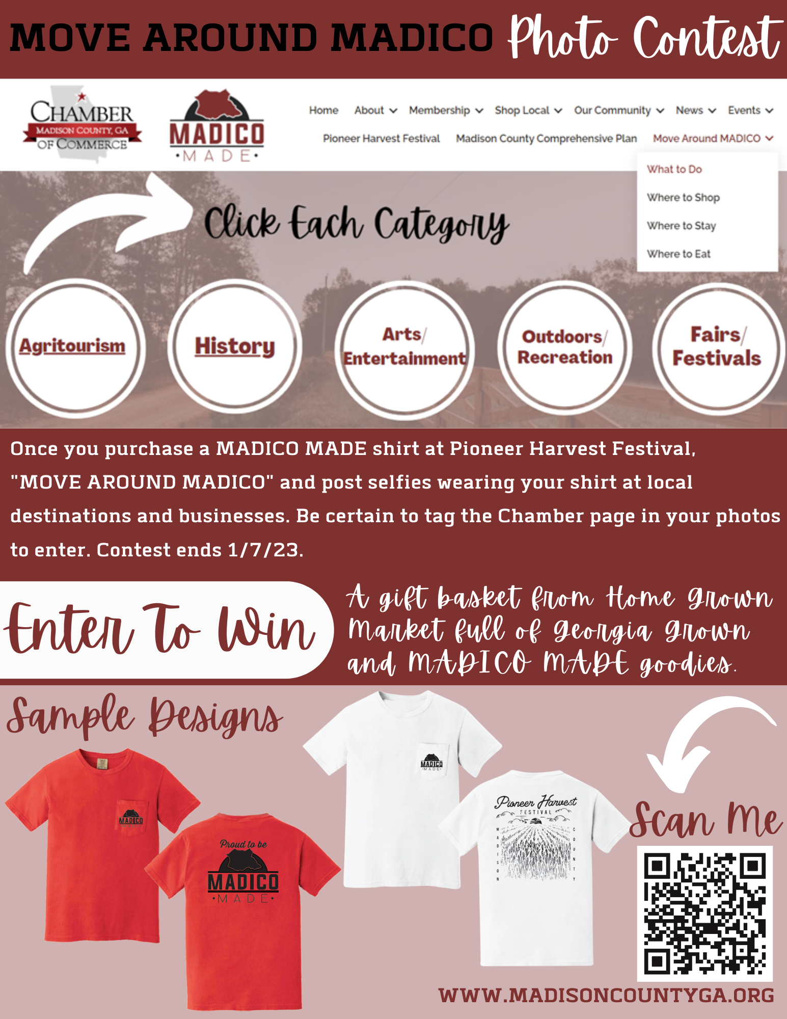 Once you purchase a shirt, MOVE AROUND MADICO and post selfies wearing your shirt at local destinations and businesses for a chance to win a gift basket from Home Grown Market full of Georgia Grown and MADICO MADE goodies. Be certain to tag the Chamber page in your photos to enter. Contest ends 1/7/23. Here are some ideas: https://www.madisoncountyga.org/what-to-do/
