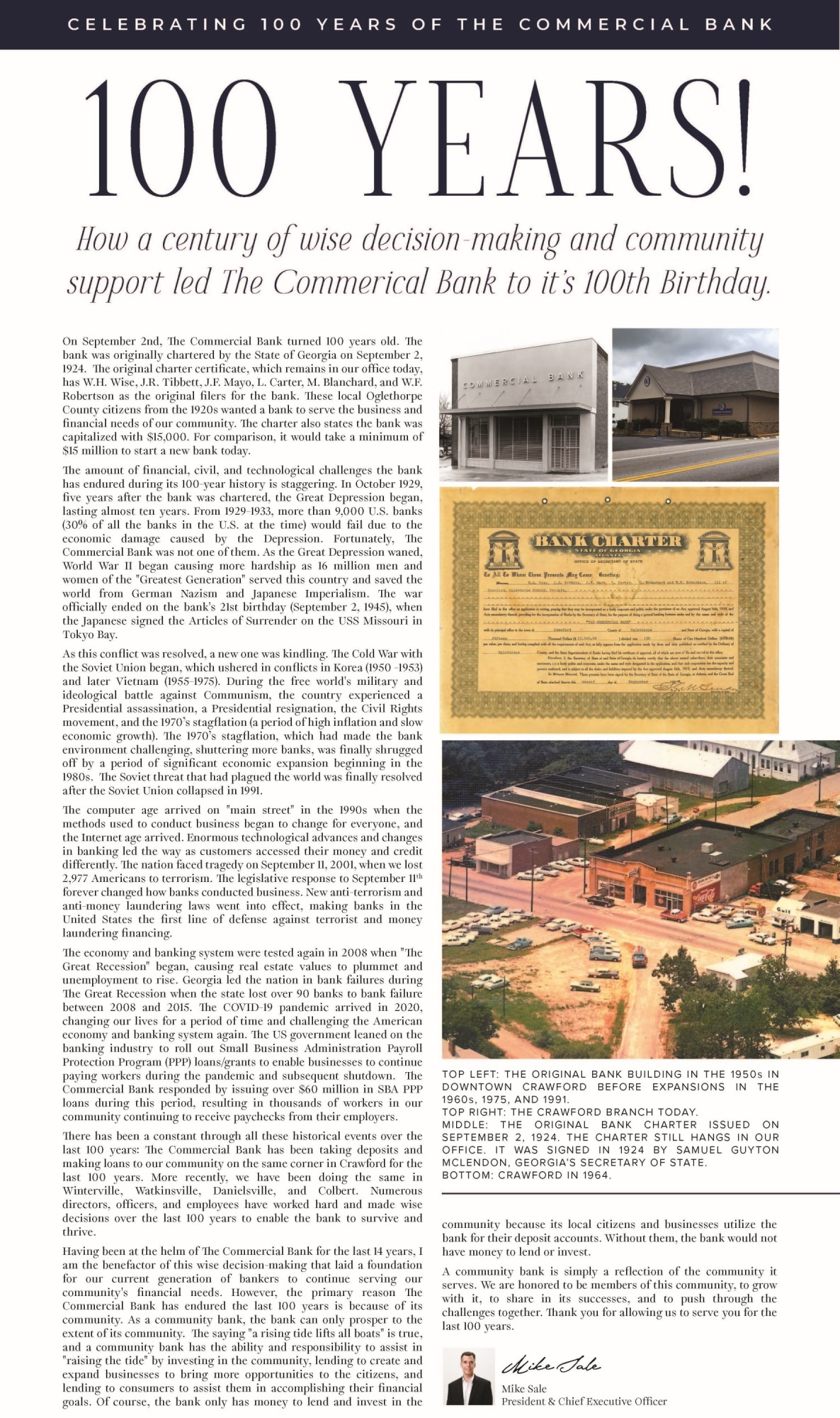 The Commercial Bank is Celebrating 100 Years! Back to News Items The Commercial Bank is Celebrating 100 Years! By The Commercial Bank 9/2/2024 Images × Share × Email Facebook LinkedIn X Pinterest Powered By GrowthZone