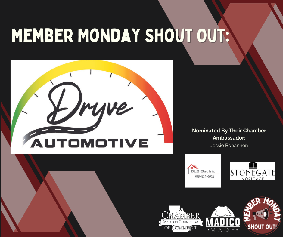 Shout Out to Dryve Automotive for being our Member Monday Feature! Dryve Automotive was nominated by their Chamber Ambassador Jessie Bohannon of Stonegate Mortgage and DLB Electric.